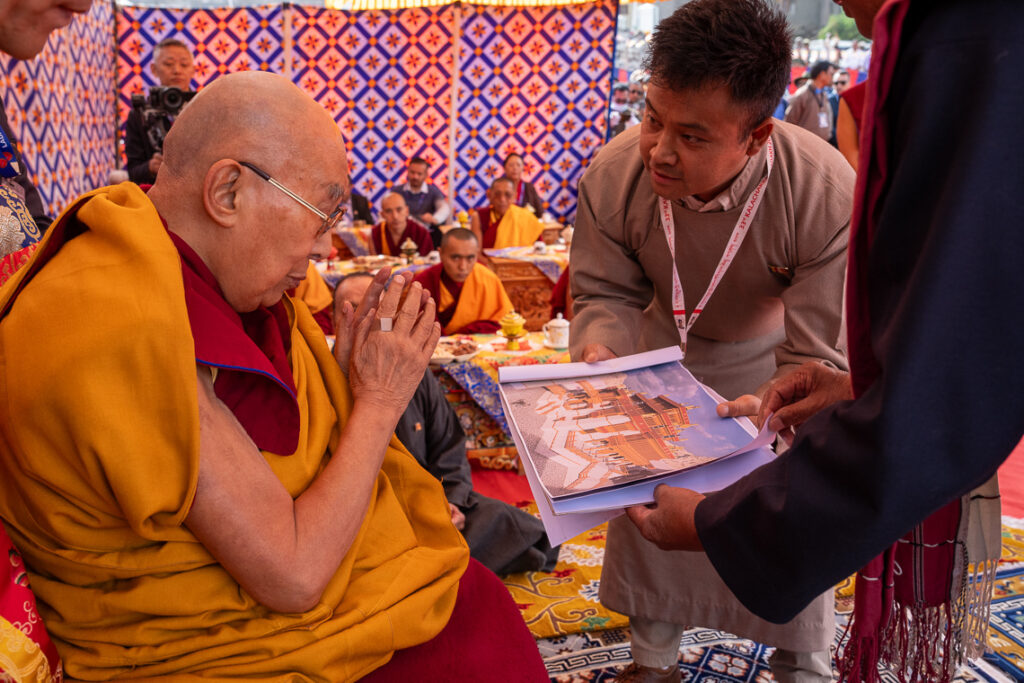 དེ་རིང་འདིར་ཁྱོད་རང་ཚོས་ལྷ་ཁང་རྙིང་པ་བཤིག་ནས་གསར་པ་ཞིག་བཞེངས་པའི་འཆར་གཞི་རེད། ལྷ་ཁང་སྟོང་པ་ཞིག་ལ་ཧ་ལས་པ་གང་ཡང་ཡོད་པ་མ་རེད། གཙོ་བོ་དཔེ་ཆར་བལྟ་དགོས། དཔེ་ཆར་བལྟ་རྒྱུ་ནི་ཧ་ཅང་གལ་ཆེན་པོ་རེད། འདིར་ཁྱོད་ཚོས་གཙུག་ལག་ཁང་གསར་པ་ཞིག་རྒྱག་རྒྱུའི་འཆར་གཞི་རེད། ཕྱིན་ཆད་འདིར་མཚན་ཉིད་ཀྱི་གཞུང་དང་། ཚད་མའི་གཞུང་། དབུ་མའི་གཞུང་སོགས་འཁྲིད་ས་དང་། རྩོད་པ་བརྩད་ནས་བདར་ཤ་གཅོད་ས་ཞིག་ཡོང་བར་ངོས་ཀྱིས་སྨོན་ལམ་རྒྱག་གི་ཡིན། རེ་བ་ཡོད། ཐུགས་རྗེ་ཆེ། ཞེས་བཀའ་སློབ་སྩལ་གྲུབ་མཚམས་ཆིབས་འཁོར་བརྒྱུད་ལ་དྭགས་མི་མང་ཡོངས་ཀྱི་དད་རྟེན་ཆོས་ཀྱི་ལྟེ་གནས་སམ་དྷརྨ་སཱེན་ཊིར་ཞེས་པའི་གཙུག་ལག་ཁང་དུ་ཆིབས་བསྒྱུར་བསྐྱངས་ཤིང་། དེར་ཁྲིག་རྩེ་རིན་པོ་ཆེ་སོགས་ཀྱིས་ཕེབས་བསུ་དང་བཅས་གཙུག་ལག་ཁང་དུ་༸ཞབས་སོར་འཁོད་དེ་ཐོག་མར་རྟེན་གཙོ་ཇོ་བོའི་སྐུ་བརྙན་དང་། སྟོན་པའི་སྐུ་བརྙན་རིན་པོ་ཆེ་སོགས་ལ་མཇལ་ཁ་ཞུས་རྗེས་བཞུགས་ཁྲིར་འཁོད་ཅིང་། དགོན་ཚོགས་སྐུ་ཚབ་ནས་མཎྜལ་རྟེན་གསུམ་འདེགས་འབུལ་ཞུས་མཚམས་སྤྱི་ནོར་༸གོང་ས་༸སྐྱབས་མགོན་ཆེན་པོ་མཆོག་གིས་བཀའ་སློབ་སྩལ་དོན།