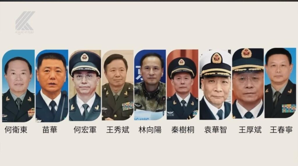 ཐེངས་དེར་ཕྱིར་འབུད་བཏང་བའི་དམག་སྤྱི་མཐོ་ཤོས་གྲས་གཉིས་པ་དེ་ཕྱི་ལོ་༢༠༢༡ ནས་༢༠༢༤ བར་རྒྱ་ནག་གི་ལྷོ་རྒྱུད་དམག་དོན་ཁང་གི་དམག་སྤྱི་ཟུར་པ་དང་། དབུས་དམག་དོན་ལྷན་ཁང་གི་ཨུ་ཡོན་དང་ཆབ་སྲིད་སྡེ་ཚན་གྱི་འགན་འཛིན་(Miao Hua) ཟེར་བ་དེ་ཡིན་འདུག དེ་རྗེས་ཀྲུང་དབྱང་དམག་དོན་ཨུ་ཡོན་ལྷན་ཁང་ཆབ་སྲིད་སྡེ་ཚན་གྱི་དེ་སྔོན་རྒྱུན་ལས་འགན་འཛིན་གཞོན་པ་(He Hongjun) དང་། ཀྲུང་དབྱང་དམག་དོན་ཨུ་ཡོན་ལྷན་ཁང་མཉམ་འབྲེལ་དམག་འཐབ་བཀོད་འདོམ་ལྟེ་གནས་ཀྱི་དེ་སྔོན་རྒྱུན་ལས་འགན་འཛིན་གཞོན་(Wang Xiubin) ། ཤར་ཕྱོགས་དམག་ཁུལ་ཁང་གི་དེ་སྔོན་དམག་སྤྱི་(Lin Xiangyang) ། སྐམ་དམག་གི་དེ་སྔོན་ཆབ་སྲིད་དཔོན་རིགས་(Qin Shutong) ། མཚོ་དམག་གི་དེ་སྔོན་ཆབ་སྲིད་དཔོན་རིགས་(Yuan Huazhi) ། མེ་ཤུགས་འཕུར་མདེལ་དམག་དཔུང་གི་དེ་སྔོན་དམག་སྤྱི་(Wang Houbin) ། དྲག་ཆས་ཉེན་རྟོག་དཔུང་སྡེའི་དེ་སྔོན་དམག་སྤྱི་(Wang Chuning) བཅས་དམག་དཔོན་དགུ་གོ་གནས་ནས་ཕྱིར་འབུད་བཏང་འདུག བཅིངས་གྲོལ་དམག་གི་དམག་སྤྱི་དེ་དག་གིས། དམར་ཤོག་ཚོགས་པའི་སྒྲིག་ཁྲིམས་ལ་སྒྲིག་འགལ་ཚབས་ཆེན་བྱས་པ་དང་། གོ་གནས་ལ་བརྟེན་ནས་ཁྲིམས་འགལ་གྱིས་དངུལ་འབོར་ཆེན་ལྐོག་ཟ་བྱས་པའི་དོགས་གཞི་ཡོད་པ་མ་ཟད། ཁོ་ཚོའི་གྱོད་དོན་ཧ་ཅང་ཚབས་ཆེན་དང་ཉེན་ཁ་ཆེ་བའི་མཇུག་འབྲས་འབྱུང་སྲིད་པས། ད་ལྟ་རྒྱ་ནག་དབུས་སྒྲིག་ཁྲིམས་ཞིབ་བཤེར་ལས་ཁུངས་ཟེར་བས་དམག་སྤྱི་དེ་དག་ལ་ཞིབ་བཤེར་བྱེད་བཞིན་པ་ཡིན་པ་བརྗོད་འདུག།