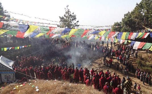 ལྷ་བསང་དུད་པའི་སྤྲིན་དཔུང་གཏིབས། །སྣ་ལྔའི་དར་གྱི་གཞའ་ཚོན་བཀྱེས། །