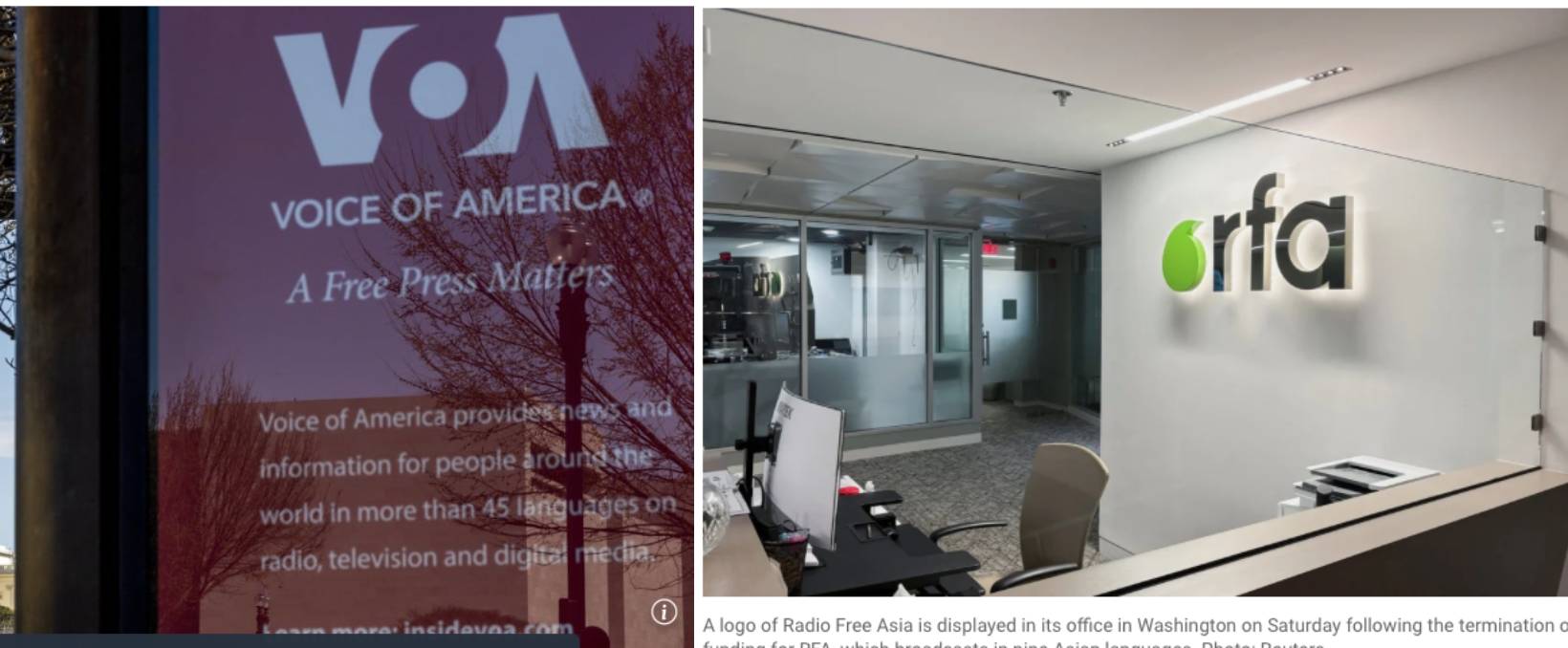 བདུན་ཕྲག་སྔོན་མའི་གཟའ་པ་སངས་ཀྱི་མཚན་མོར་ཨ་རིའི་སྲིད་འཛིན་ཊོམ་གྱིས་ཨ་རིའི་ལྷན་ཁང་ཁག་ཅིག་གི་འགྲོ་གྲོན་ཉུང་དུ་གཏོང་དགོས་པ་དང་། འགའ་ཤས་མེད་པ་བཟོས་ཡོད་འདུག་ཅིང་། དེ་དག་གི་ཁྲོད་ཨ་རིའི་རྒྱལ་སྤྱིའི་གསར་འགྱུར་ལྷན་ཁང་(USAGM)ཡང་ཚུད་ཡོད་འདུག་ཅིང་། རྒྱལ་སྤྱིའི་གསར་འགྱུར་ལྷན་ཁང་དེའི་ཁོངས་སུ་ཨ་རིའི་རླུང་འཕྲིན་ཁང་དང་ཨེ་ཤེ་ཡའི་རང་དབང་རླུང་འཕྲིན་ཁང་། ཡོ་རོབ་རླུང་འཕྲིན་ཁང་བཅས་ཚུད་ཡོད་འདུག་པས། རླུང་འཕྲིན་ཁང་དེ་དག་བཀག་འགོག་བྱས་པར་རྒྱ་ནག་གི་གཞུང་འབྲེལ་གསར་ཁང་གོ་ལའི་དུས་བབ་ཀྱི་རྩོམ་སྒྲིག་པས་སྲིད་འཛིན་ཊོམ་ལ་བསྔགས་བརྗོད་བྱས་འདུག ཕྱི་ཚེས་༡༨ ཉིན་ལྷོ་རྒྱ་ནག་ཞོགས་པའི་ཆ་འཕྲིན་གྱིས་གནས་ཚུལ་སྤེལ་གསལ་ལྟར་ན། རྒྱ་ནག་གཞུང་གི་སྟངས་འཛིན་འོག་ཡོད་པའི་གོ་ལའི་དུས་བབ་གསར་ཁང་གི་རྩོམ་སྒྲིག་པས་ཨ་རིའི་སྲིད་འཛིན་ཊོམ་གྱིས་ཨ་རིའི་རླུང་འཕྲིན་ཁང་དང་ཨེ་ཤེ་ཡའི་རང་དབང་རླུང་འཕྲིན་ཁང་བཀག་པར་བསྟོད་བསྔགས་བཏང་ཡོད་པར་བཀོད་འདུག་པ་བཞིན།